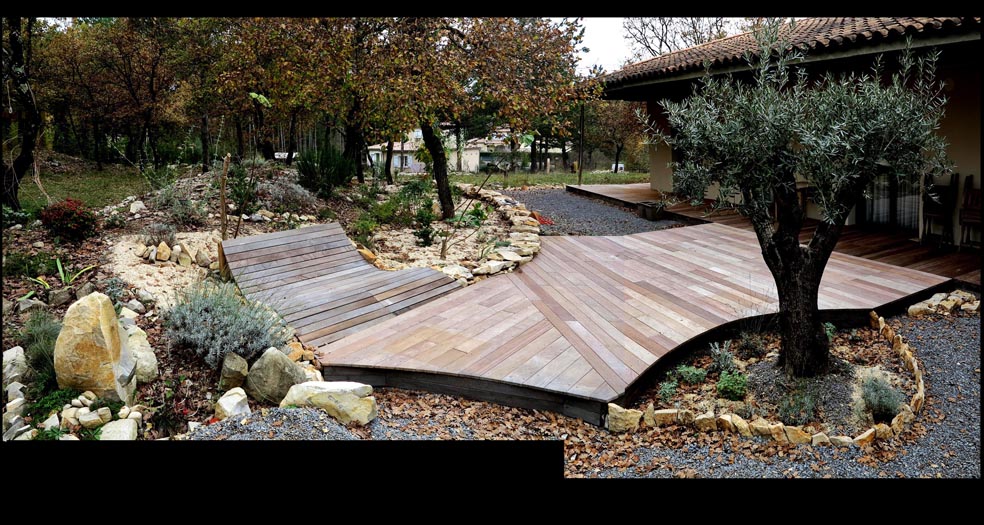 Une autre partie du jardin, vue à l'automne : la terrasse avec sa banquette ergonomique intégrée.